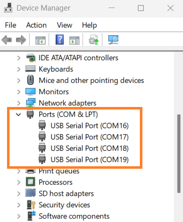 Ports 1, 2, 3, and 4 of a 4-port USB-to-Serial adapter have been